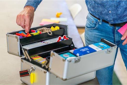 Goed gereedschap: Apple MacBook, AirPods Pro en iPhone. Tools zoals Notion, Slack, Miro & Google Workspace. En je eigen 'field kit': een workshop koffer en materialen. Om ons werk optimaal te faciliteren.